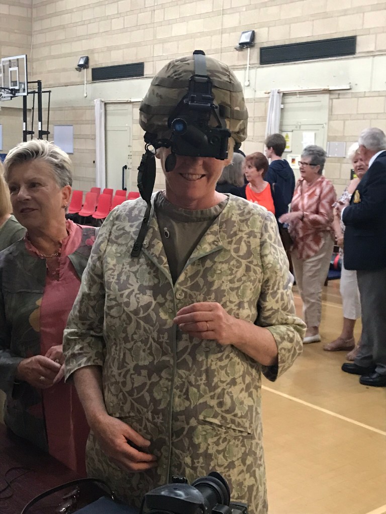 On Tuesday we went to an open evening at the Warley Army Reserve Centre organised by 124 (Essex) Transport Squadron, whose reservists provide support to the Royal Logistic Corps as part of the UK Reaction Force. As such these part-timers, who come from all walks of civilian life, can find themselves deployed anywhere in the world, including in recent years Afghanistan and Iraq. Reservists we talked to included a builder, the manager of a job centre, and a clerk from the Family Court, the last of these never happier than when driving her MAN Logistic Support Vehicle (a 6-tonne truck) off road. After a presentation of claps to three long-serving reservists by Dennis Rensch DL we were able to look round various displays and demonstrations, including nuclear and chemical contamination suits of the type familiar from the clean-up after the Salisbury novichok attack, and weapons – two of the men there were in top 50 of reservist marksmen. Supper followed, including a fine sausage casserole cooked by the Regimental Catering Team, and the chance to talk to reservists and their families who, like all service families, have a lot to put up with in terms of disruption to their lives and anxiety.