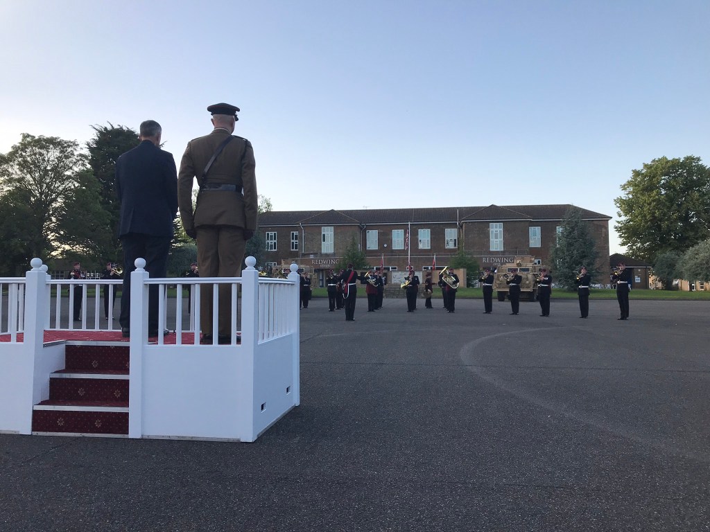 Friday afternoon saw us close to home at Little Totham, where the Lord-Lieutenant was unveiling the village’s first war memorial, in the shape of three ‘Tommy’ silhouettes made specially in steel. Among the guests was the Tommies’ designer, Martin Barraud. In the evening we went up to Carver Barracks, Wimbish, for a cocktail party and Beating Retreat with the officers of 35 Engineer Regiment (Explosive Ordnance Disposal & Search). Goodness, but the Army do these things well (including but not just the cocktails) and are unfailingly hospitable and welcoming. There was something timeless about the Beating Retreat ceremony, which was performed by the Band of Parachute Regiment. Along one side of the parade ground was a large tent for guests, and in front of it a row of sofas for senior officers and VIPs, including Mick Biegel DL who took the salute. There was a smaller tent to one side for other officers, who kept a low profile until the moment came to sing the Corps song, ‘Hurrah for the C.R.E.’, which originated during the South African War and is in a mixture of English and Zulu. Before that, the moment when the flag is lowered and Sunset Hymn is played never fails to be spine-tingling.