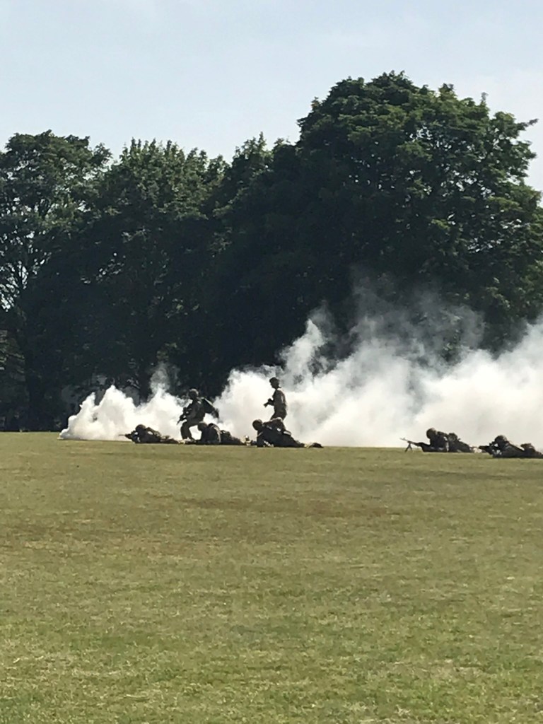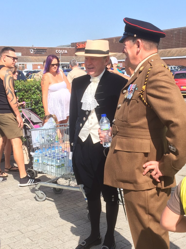 The big day, and the hottest of the year so far, was Saturday. The morning took us to Canvey Island, where they lay on a very fine parade, service, and displays. The parade, headed by the Sutherland Pipes and Drums and including serving men and women as well as veterans (one Chelsea Pensioner), the Royal British Legion, and the Canvey Air Cadets’ Band, as well as Army cadets and the full range of scouts, sea scouts, guides, etc, took us though the centre of town to the war memorial in front of the Paddocks Community Centre, where chairs had been set out on the grass for the open-air service, mostly in the shade. When that was over we turned down the offer of refreshments to get to Colchester in time for the second half of the Garrison Show, where we were guests of the Garrison Commander, Lt-Col Steve Caldwell, and the new Commander of 16 Air Assault Brigade, Brigadier John Clark. The main afternoon event was the Essex and Veterans and Cadet Armed Forces Day parade, led by our old friends the Band of the Parachute Regiment. Owing to the heat, we were encouraged to spend less time inspecting the cadets than would normally be the case; even so, by the time they marched off there were fourteen fewer in the ranks than at the beginning, that number having fainted or been pulled out as they showed signs of being about to. The Veterans all survived to parade another day – one we talked to had been at Little Totham yesterday and was going to be at Maldon on Sunday.