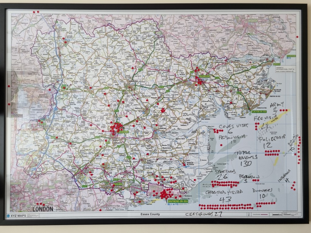 I have just started my twenty-second week as High Sheriff of Essex. To keep track of my adventures I have put up a map of the county in my office. In addition to red dots on the map for where I have been on official duties, I also keep a few running totals.