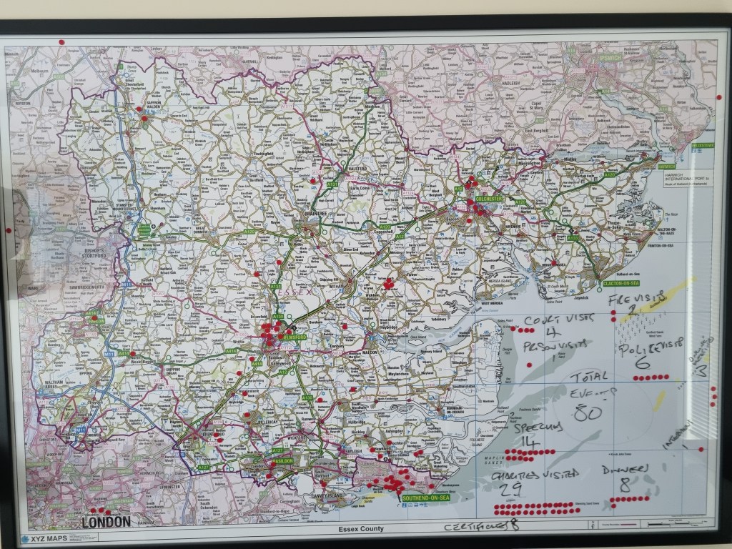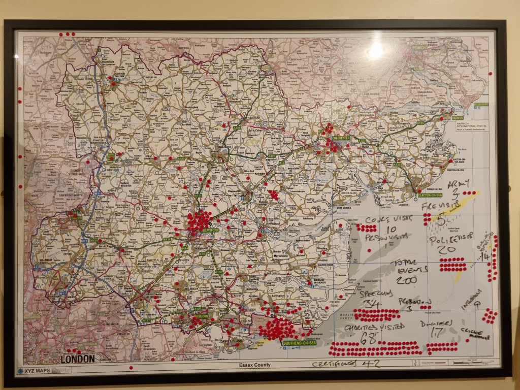 Almost at the end of my 49th week as High Sheriff of Essex and of my year-long tenure. To keep track of my adventures I have put up a map of the county in my office. In addition to red dots on the map for where I have been on official duties, I also keep a few running totals.
