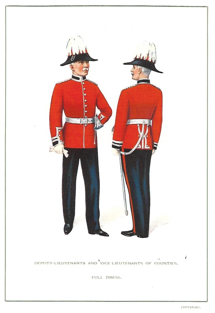 this Deputy Lieutenant uniform is now worn on every occasion… The High Sheriff of a County…, being a Deputy Lieutenant, puts on his red coat to greet the learned judges on their arrival at the assize town: he does so because it is a court dress, as all military uniforms are received by the Sovereign.