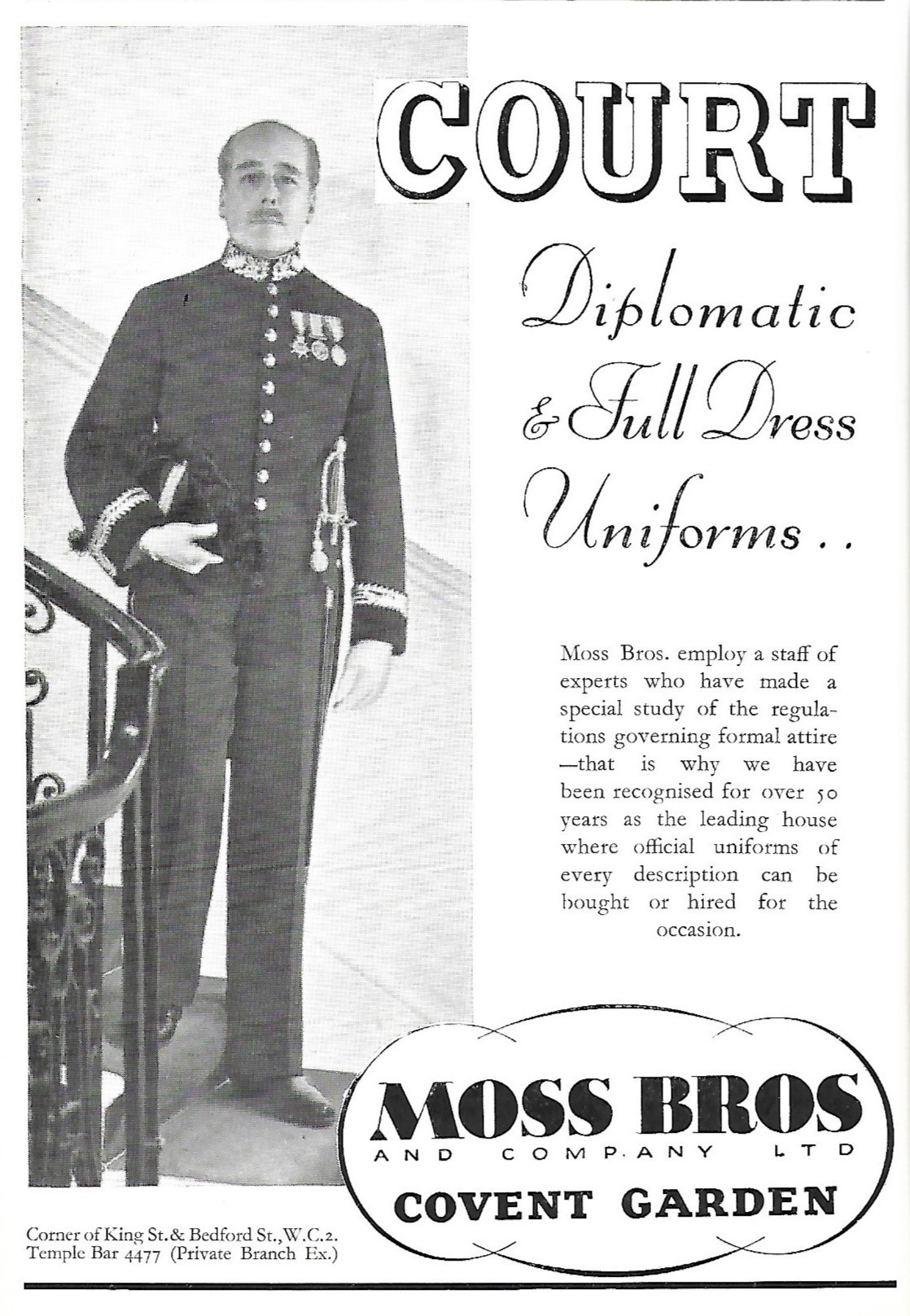 My dress for official occasions occasioned a little difficulty, as not being entitled to wear Service Uniform I had to procure a new Court Dress. My application to the Board of Trade for the necessary Clothing Coupons was refused on the grounds that “Court Dress was unessential when judged by war time standards”. Not being satisfied with this explanation I cast around in other directions and eventually procured from the universal providers Messrs Moss Bros & Coy Ltd a complete Court Dress including sword, hat, and mantle, which might have been cut for me in Savil [sic] Row, without having to give up any coupons. I think this may be of interest to any of my successors faced with a similar difficulty.[37]
